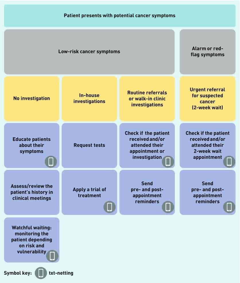 A weakness of current safety-netting practices is the reliance on patients to re-appraise their symptoms and to make follow-up appointments.Worry about wasting the doctor’s time and not wanting to bother the doctor are well-documented barriers to help seeking in the UK. For patients who are given safety-netting advice when they consult, a potential pitfall is that 40–80% of medical information provided by healthcare practitioners is forgotten immediately, and almost half of the information that is remembered is recalled incorrectly (1). Evidence also suggests that misunderstanding and miscommunication are commonplace in primary care consultations (2). Could technology-based interventions (like text messaging) help? See the diagram on the right where they suggest where something like a text message might help in someone presenting with potential cancer symptoms (see place where the the phone icon is).