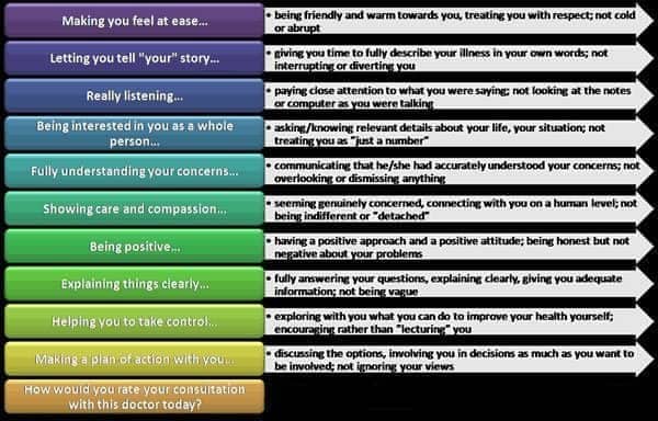 The PSQ is designed to ask patients of their experience with you. In particular it asks the patient how good the doctors was at the things listed on the right.