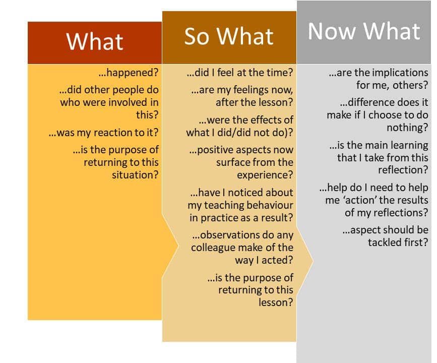 We don’t always learn from experiences on their own.. Through reflection, we can analyse experience, actively attempting to ‘make sense’ or find the meaning in it. This should lead to learning. - ‘Standing back’